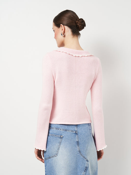 Ніжно-Рожевий Топ з Довгими Рукавами та Мереживною Оборкою