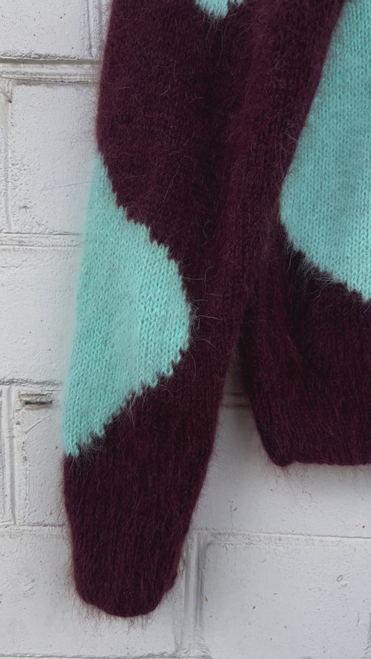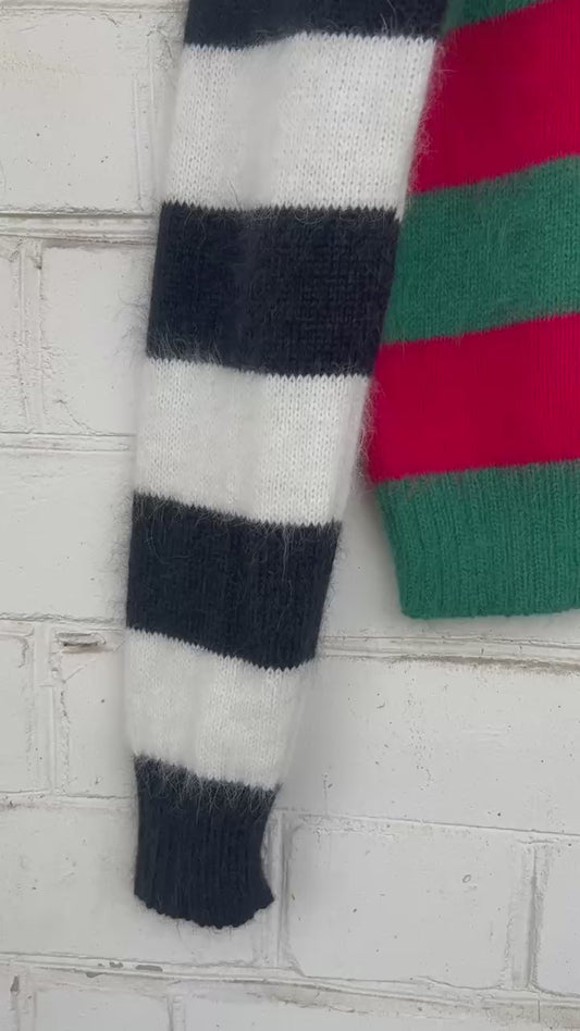 Зелено-червоний Пухнастий Светр з Чорно-білими Рукавами