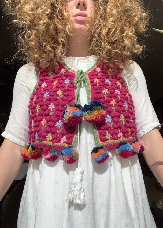 Малинова Етнічна Жилетка з Вишивкою та Помпонами