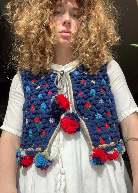 Синя Етнічна Жилетка з Вишивкою та Помпонами