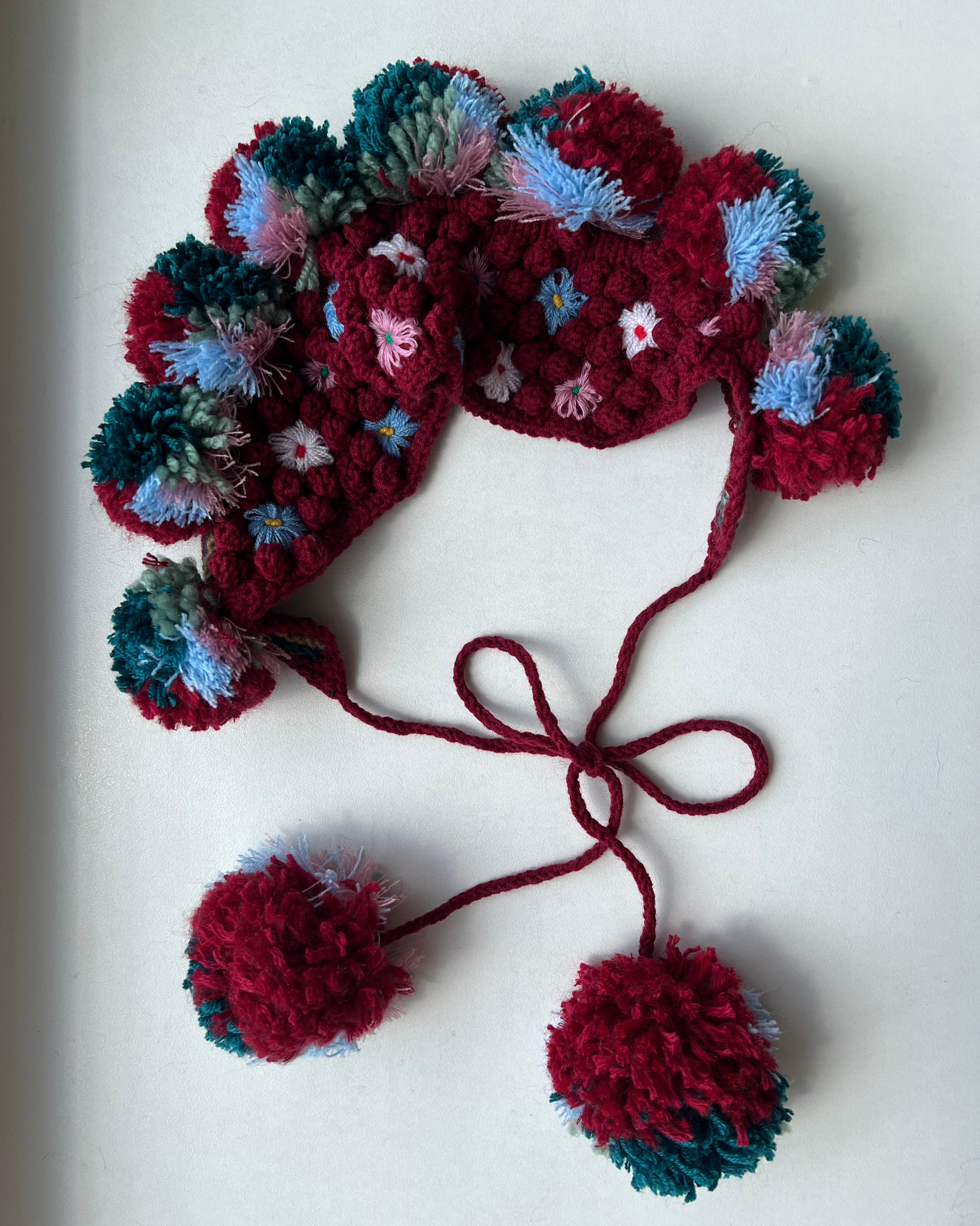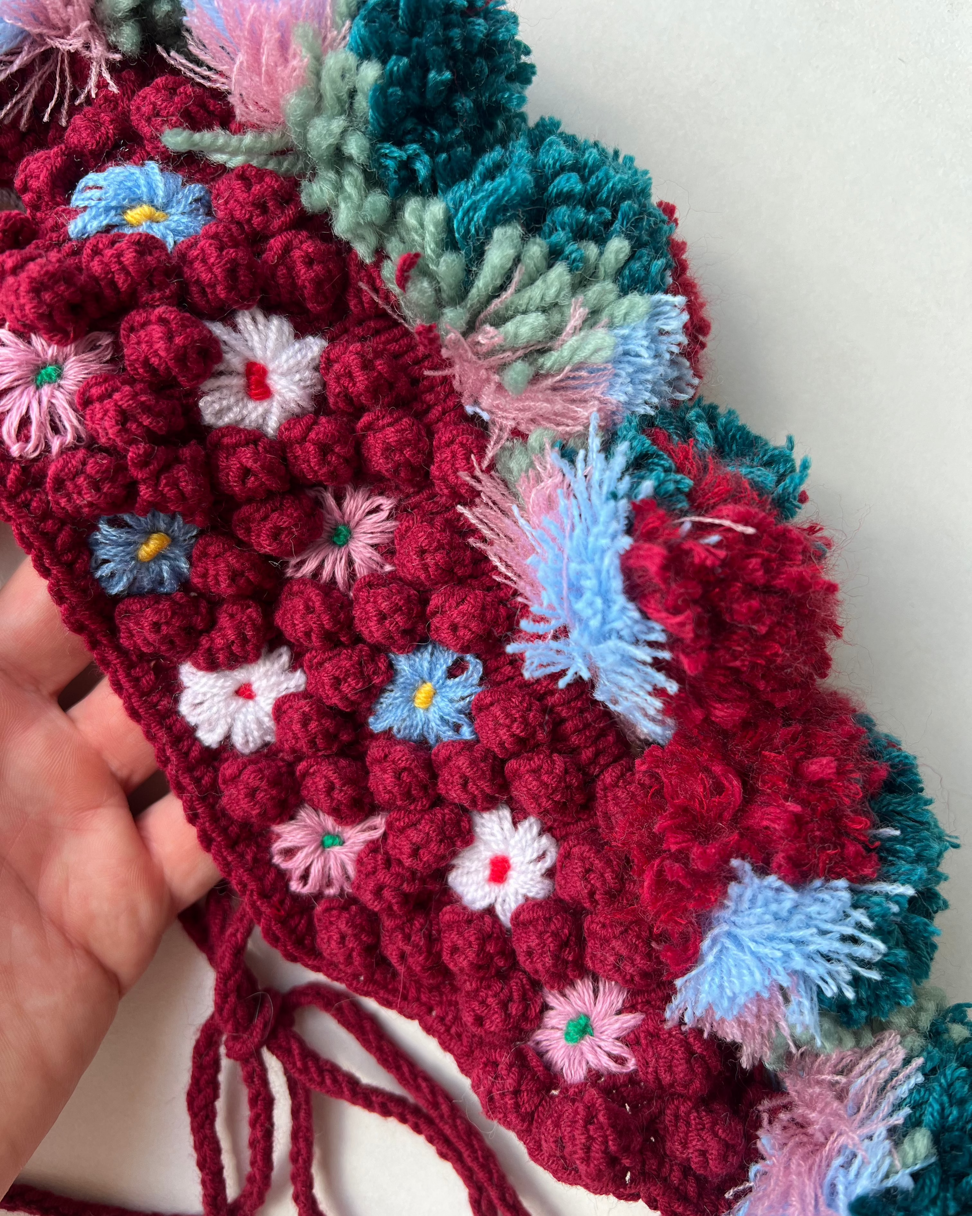 - Багряне чільце в етнічному стилі — легка й зручна пов’язка, натхненна традиційними українськими образами. Декорована ручною вишивкою та помпонами, вона створює ніжний і водночас грайливий акцент у вашому вбранні.